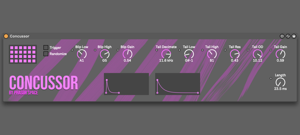 Concussor is a drum synth that combines an 808-style "blip generator" with a decimated and filtered "tail generator". Make bass drums, snares, claps, hi-hats, and toms easily.